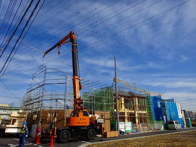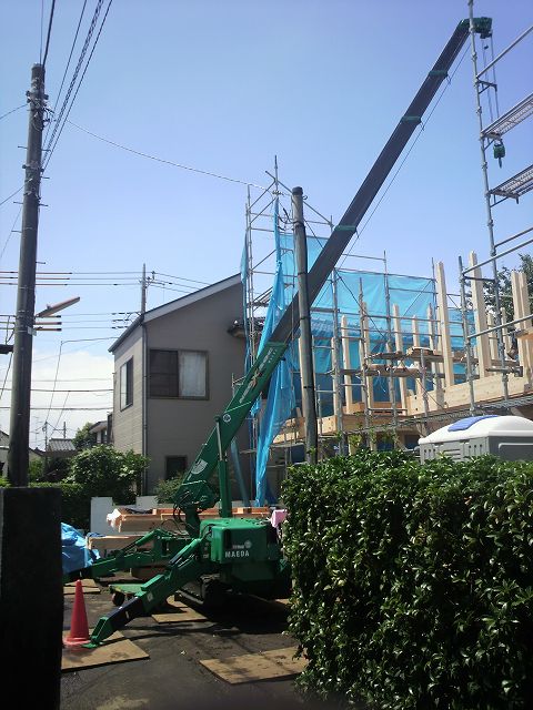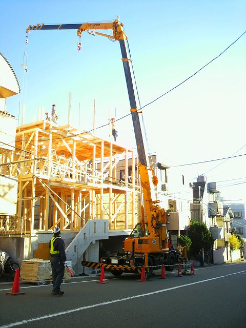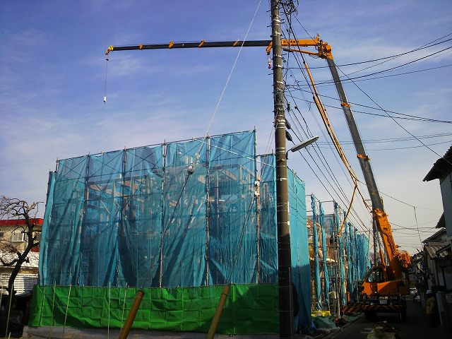 新築住宅現場の木造建て方のクレーン作業