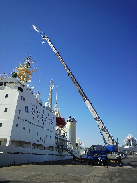 埠頭で船のレーダー・アンテナ取付を行うクレーン作業